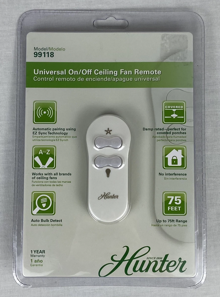 Hunter Ceiling Fan Remote Replacement . Enter the model number, and our ceiling fan. Easily install the included remote receiver into the indoor or covered outdoor ceiling fan's. Hunter's universal on/off remote control works on all hunter ceiling fans as well as many other brands. Our supportive and proven experts know just what you need to get the job done right. Learn how to install a remote receiver on your fan and pair it with a remote control using simple steps and tools. We aim to make it easy for our customers to find ceiling fan repair parts and replacement parts to get their fans up and running again. Check each product page for other buying options.